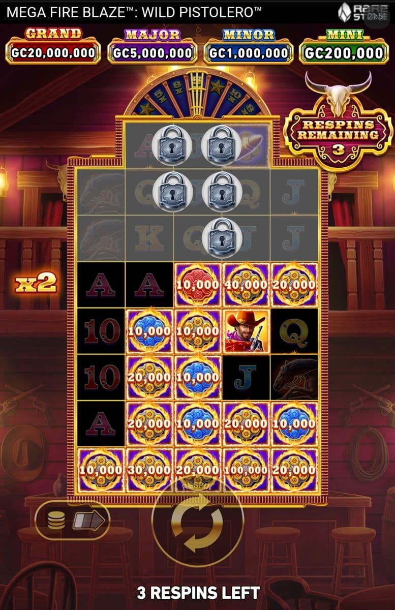 The big prize in the Wild Pistolero slot machine is the hold and spin bonus feature, referred to as the Mega Fire Blaze Respin Feature in the game, but who calls it that?